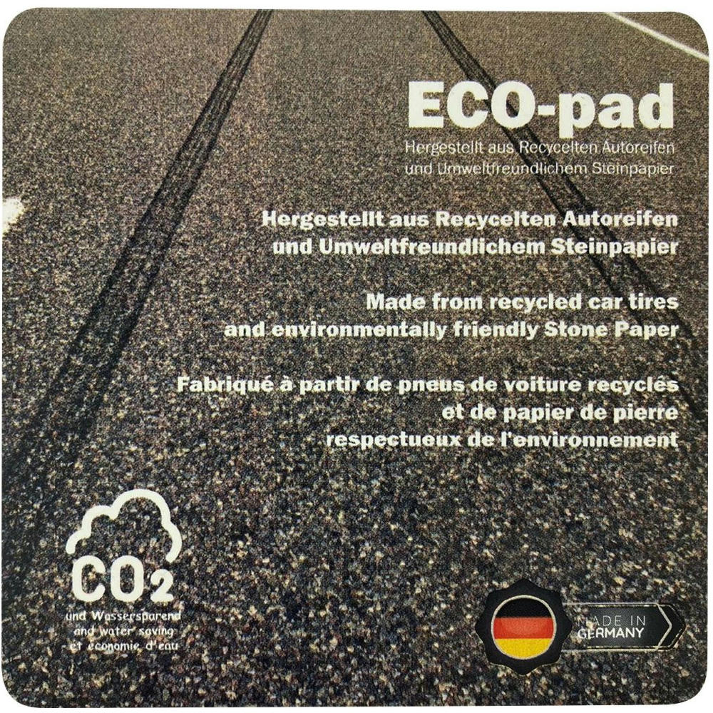 Unterseite aus 100 % in Deutschland recycelten Autoreifen ( 75 % Anteil vom Artikel), Oberfläche aus umweltfreundlichem Steinpapier, das in der Herstellung nur einen Bruchteil der Energie und Wasser benötigt. CO2 wird bei Steinpapier = 474 KG und bei normalem Papier ca. 1431 KG produziert. Made in Germany. Preis inkl. Druck auf der Vorderseite.