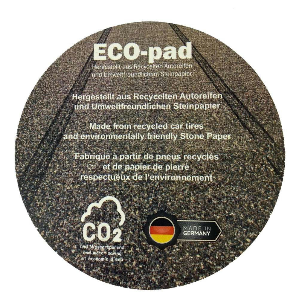 Unterseite aus 100 % in Deutschland recycelten Autoreifen ( 75 % Anteil vom Artikel), Oberfläche aus umweltfreundlichem Steinpapier, das in der Herstellung nur einen Bruchteil der Energie und Wasser benötigt. CO2 wird bei Steinpapier = 474 KG und bei normalem Papier ca. 1431 KG produziert. Made in Germany. Inkl. Druck auf der Vorderseite.