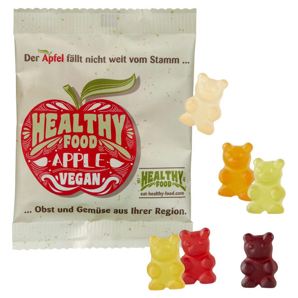 Fruchtgummi ohne Gelatine, mit Aromen und färbenden Pflanzenauszügen, farblich und geschmacklich bunt gemischt, in glänzend- oder matt-kaschiertem transparentem alternativ weißem Werbetütchen verpackt. Inhalt: ca. 20 g. Haltbarkeit: ca. 12 Monate. Preis inkl. 1-5 farbigem Druck.