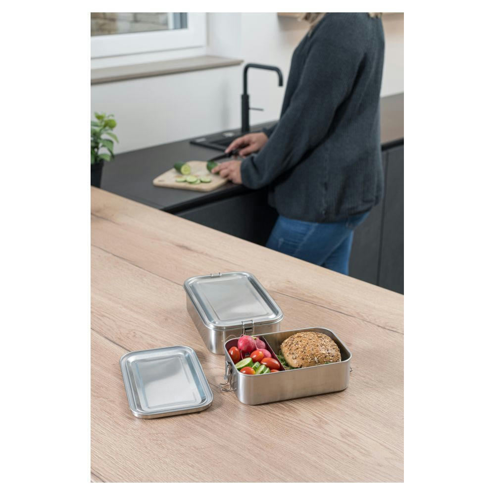 Ob für die Brotzeit im Büro, in der Schule, in der Uni, oder für Ihr nächstes Outdoor Abendteuer – mit unserer Vesperdose „steel-XXL“ aus Edelstahl sind Sie immer bestens ausgestattet und haben dabei noch mehr Platz für Ihr Proviant. Der abnehmbare Deckel verfügt über eine Silikondichtung und wird durch zwei Haltklammern sicher auf der Lunchbox gehalten. Die Brotdose ist nachhaltig, BPA-frei, robust, spülmaschinengeeignet und wird in einem Einzelkarton geliefert. Volumen: 2.000 ml Optional auch mit einem flexibel einsetzbaren Trennelement erhältlich.