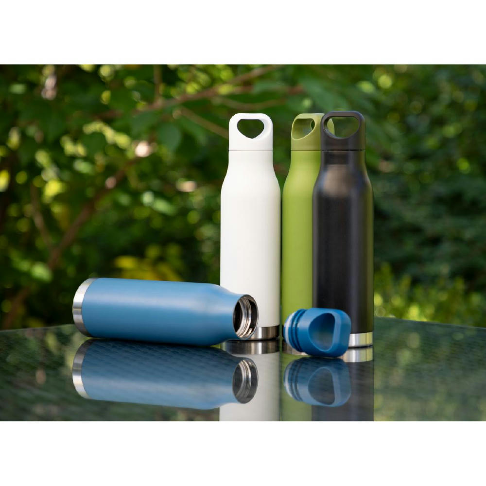 Handliche Vakuum-Isolierflasche im modernen Design, die Lust auf frische Getränke macht. Die leichte, doppelwandige Flasche aus Edelstahl mit Kunststoff-Schraubdeckel inklusive Griffloch für einfaches Tragen verfügt über eine auslaufsichere Silikondichtung und ist in eleganten Farben erhältlich. Sie ist für kalte und warme Getränke geeignet – sogar kohlensäurehaltige Durstlöscher können darin transportiert werden. Füllmenge: 480 ml.