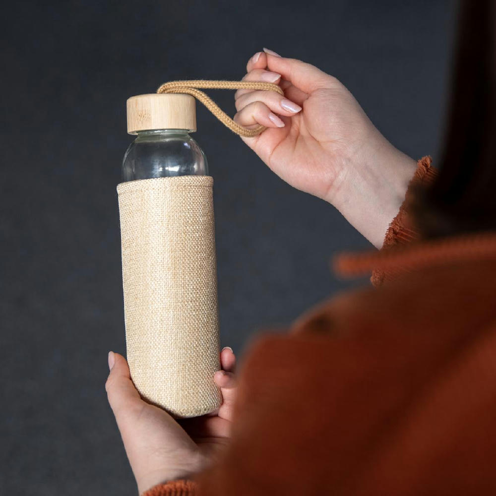 Handliche Trinkflasche aus Sodalime-Glas inklusive Schraubverschluss aus Bambus mit praktischer Schlaufe. Die griffige Hülle in natürlichem Look hält die Temperatur des Getränks länger konstant. Außerdem bietet sie bei heißem Inhalt zusätzlichen Schutz vor der erwärmten Oberfläche. Füllmenge: 0,50 Liter.
