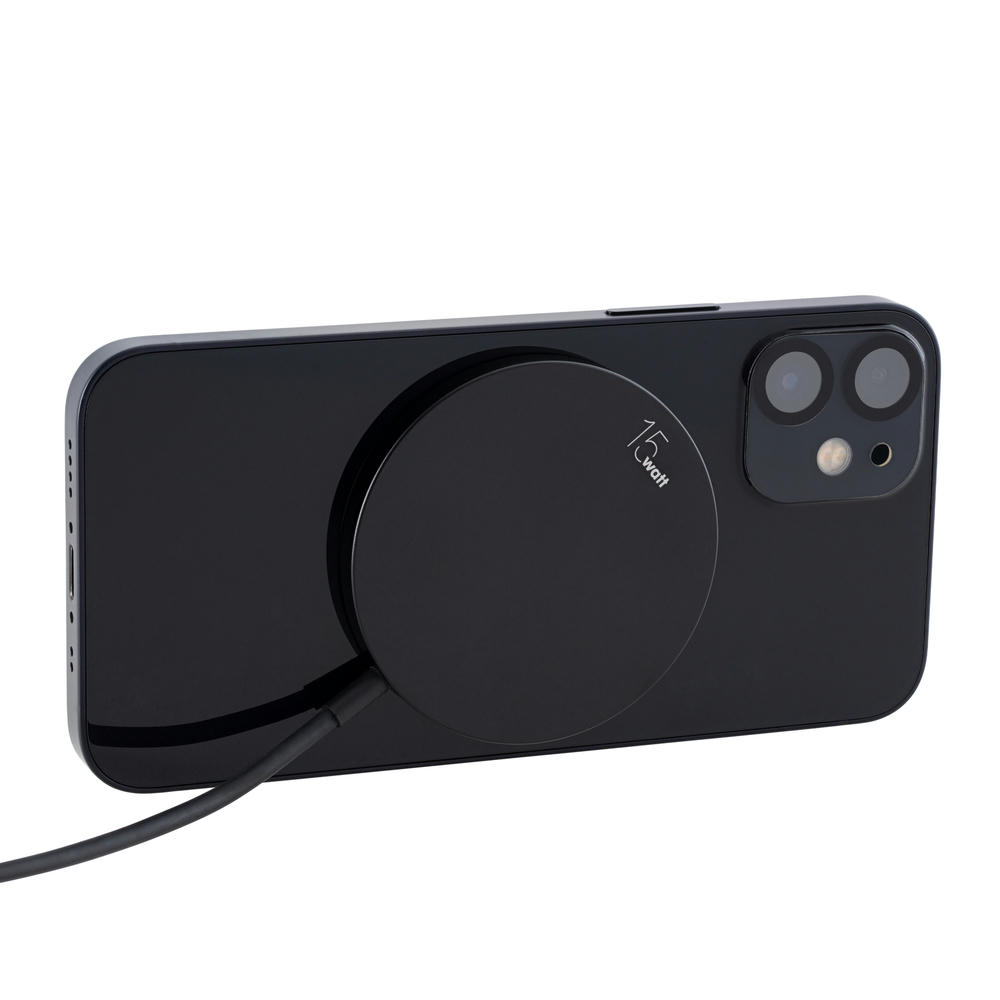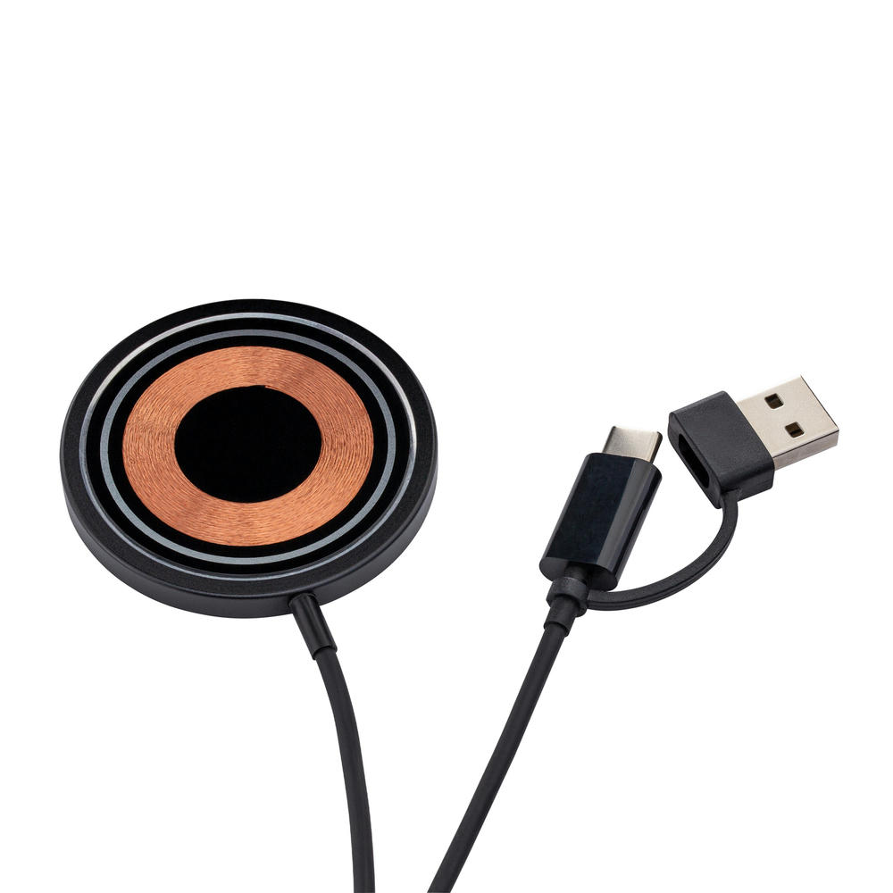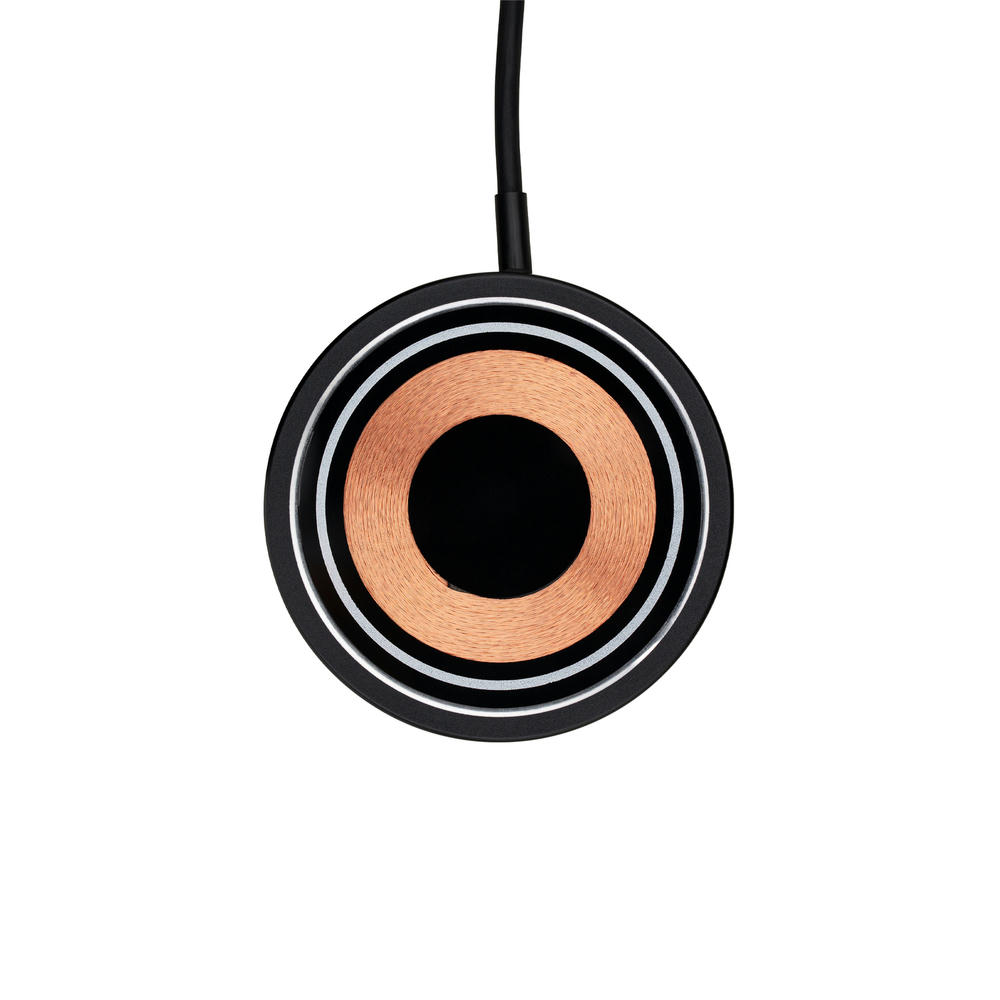 Schwarzes, glänzendes Gehäuse aus Aluminium und sichtbare Ladespirale aus Kupfer. Der magnetische Ring rund um die Ladefläche ermöglicht bei kompatiblen Endgeräten einen sicheren Halt. Inkl. integriertes Ladekabel mit einem 2-in-1 Adapterstecker - USB-C- und USB-A-Stecker.