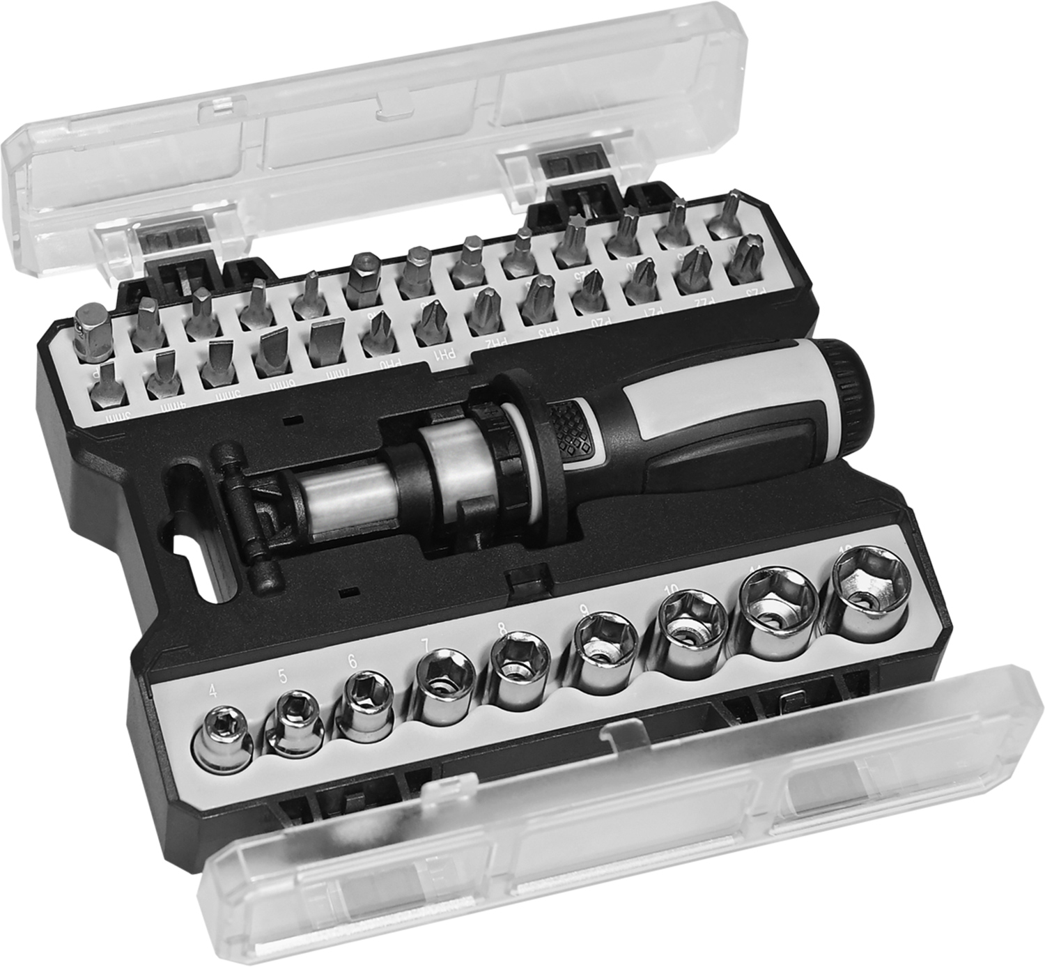 Set bestehend aus Bit-Schraubendreher mit magnetischer Bitaufnahme (1/4“) und Ratsche und insgesamt 25 Bits, 9 Stecknüssen und Adapter.