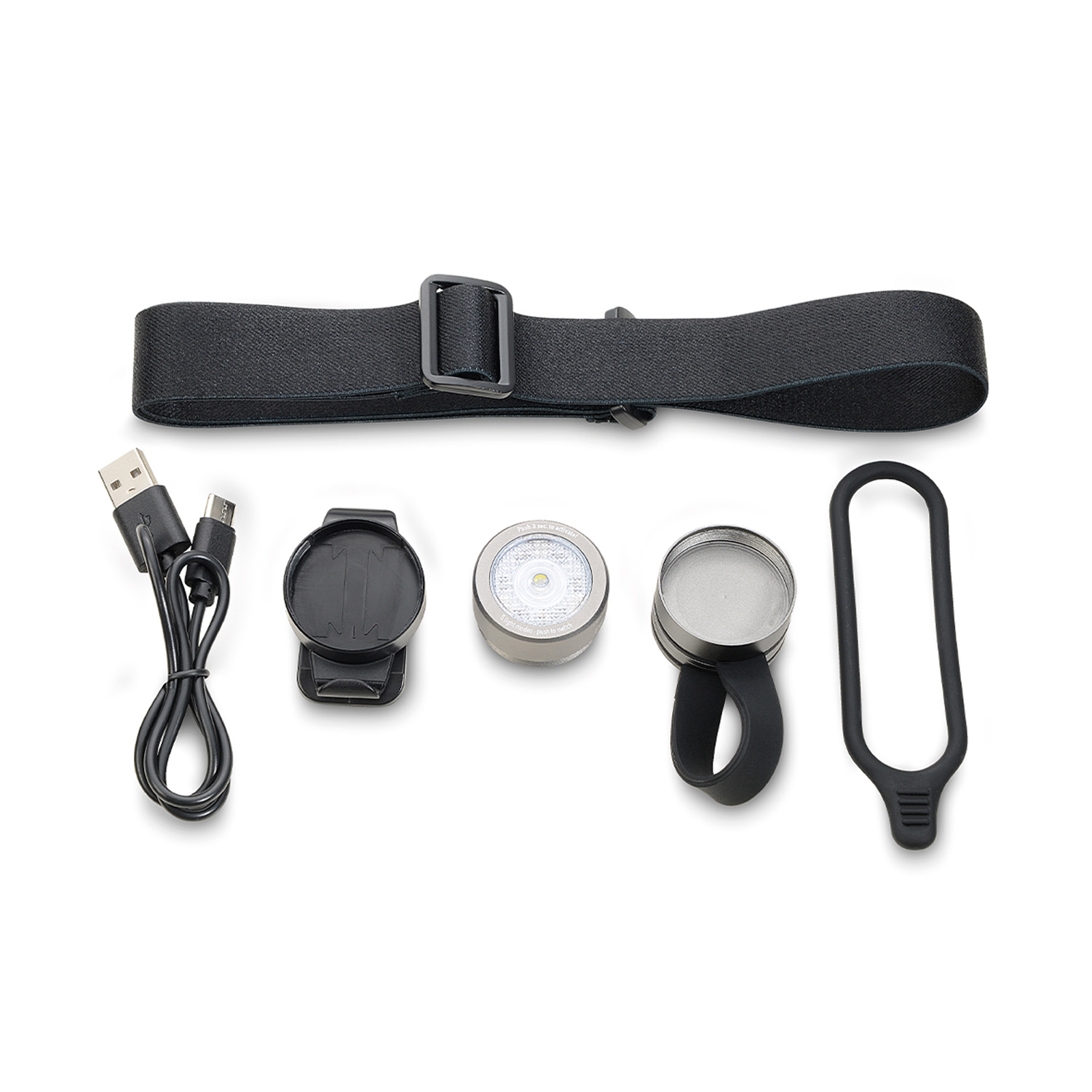 Taschenlampe Sport- und Sicherheitslicht (Warnlicht), 5 Leuchtfunktionen: 100% Licht + 50% Licht (weißes LED-Licht), durchgehend leuchtend, schnell + langsam blinkend (rotes LED-Licht), Zubehör: 1 Gürtelclip, 1 flexibles Silikonband zur Befestigung (z.B. am Fahrrad, Rucksack), elastisches Band zur Verwendung als Stirnlampe, Magnetverschluss mit Silikonband zur Befestigung an der Kleidung, etc., Lithium Polymer Batterie 200 mAh, wiederaufladbar über USB-C (3,7 Volt), inkl. Ladekabel, Überlade-/Tiefentladungsschutz.